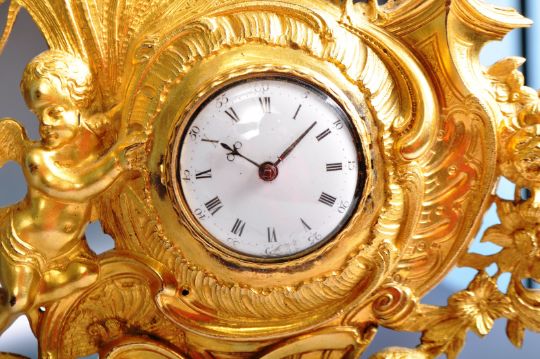 An 18th Century George III ormolu bronze clock on stand of decorative form having floral and bird detailing throughout with a pair of cherubs flanking the white enamel face having Roman numeral chapter ring. Raised on three splayed supports. Measures approx; 34cm tall.