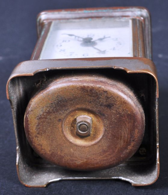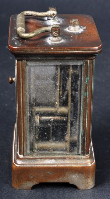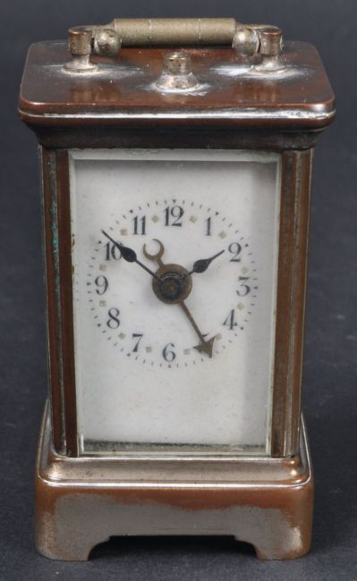 An early 20th Century miniature carriage clock (10cm). The brass cased clock having bevelled glass panels and swing handle atop. The central enamel face having a circular dial with faceted hands. One glass panel missing. Measures approx; 10cm x 5cm x 4.5cm.