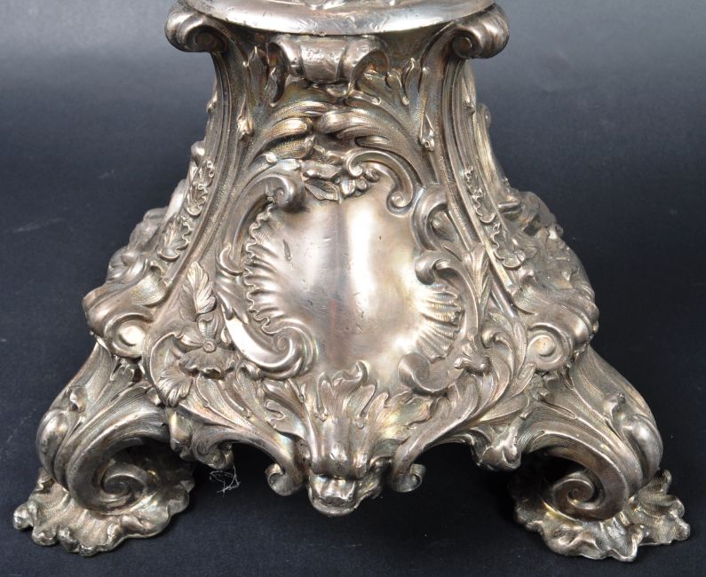 A large & heavy 19th Century Victorian silver plated centrepiece / candlestick in the manner of Elkington & Co. The candlestick with ornate cast Rococo designs including 'C' scrolls. acanthus leaves and rams head masks raised on large tripod foot base. Measures approx; 57cm x 27cm.