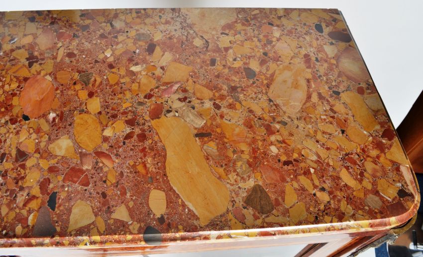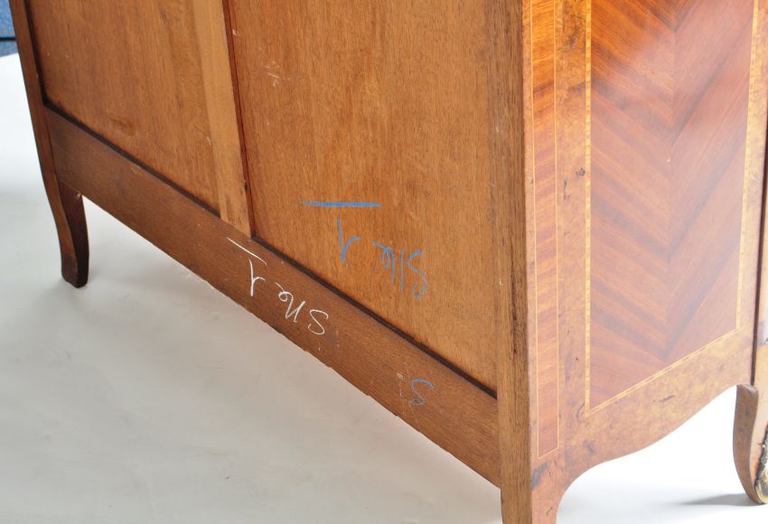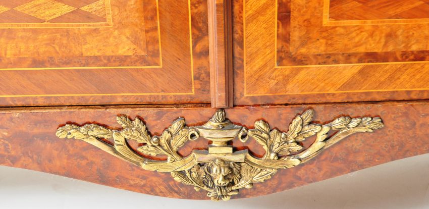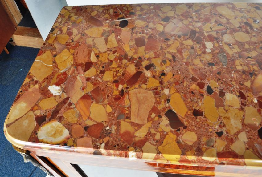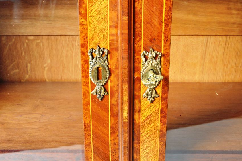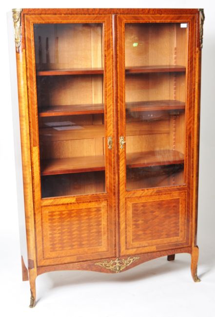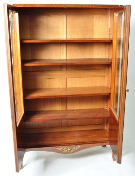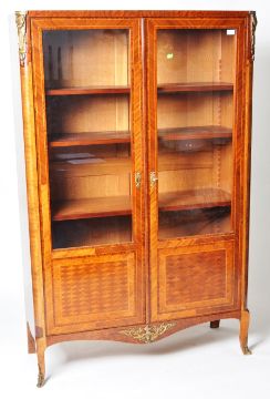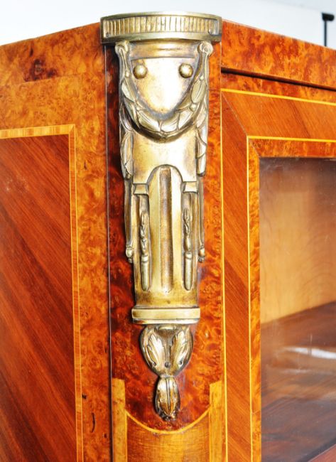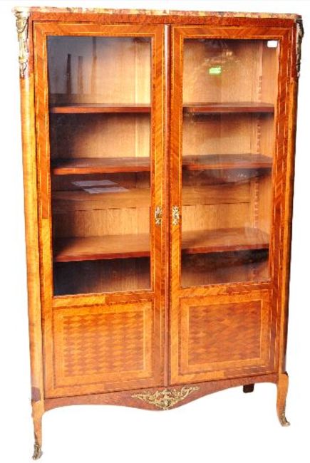 An early - mid 19th Century French Louis XVI marble topped kingwood ormolu mounted china display cabinet vitrine. The twin door cabinet with long glazed doors and ormolu mounted sides. Inlaid with specimen woods throughout. The interior set with adjustable shelves and all raised on small kick legs with further ormolu to the apron. The top set with a thick Alep marble top. Key present. Overall in good condition. Measures approx; 178cm x 112cm x 41cm.