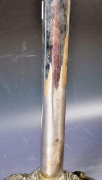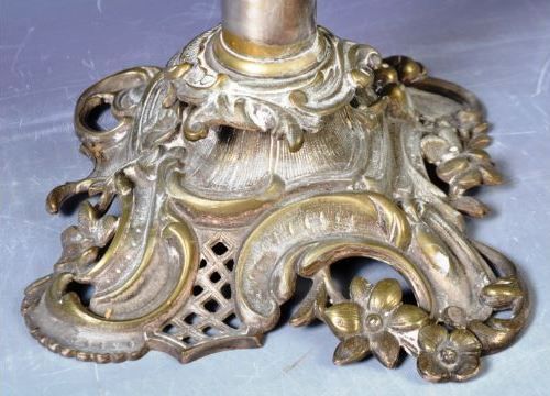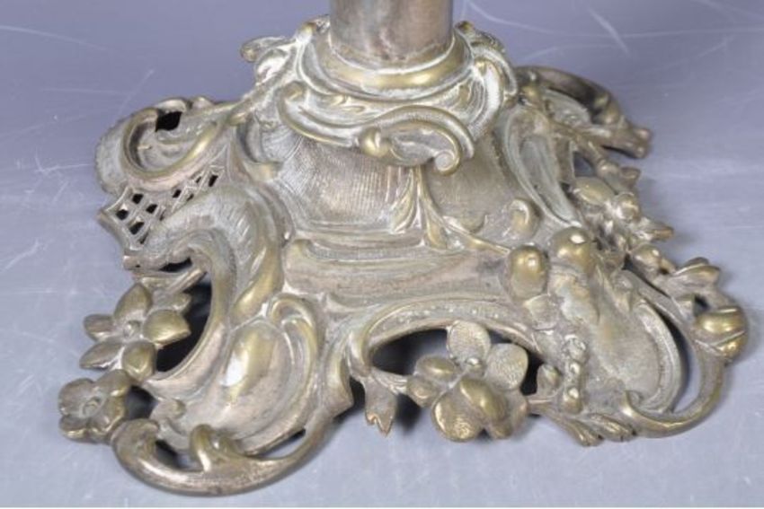 A 19th Century silver plated candlestick in the manner of Elkington having an ornate oak leaf top with relief decorated knop raised over a cylindrical column raised over the ornate Rococo influence 'C' scroll and floral base. Measures approx; 47cm tall.