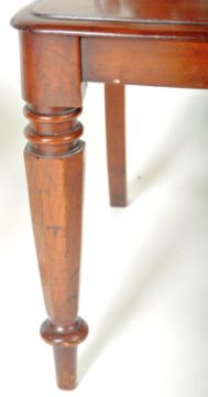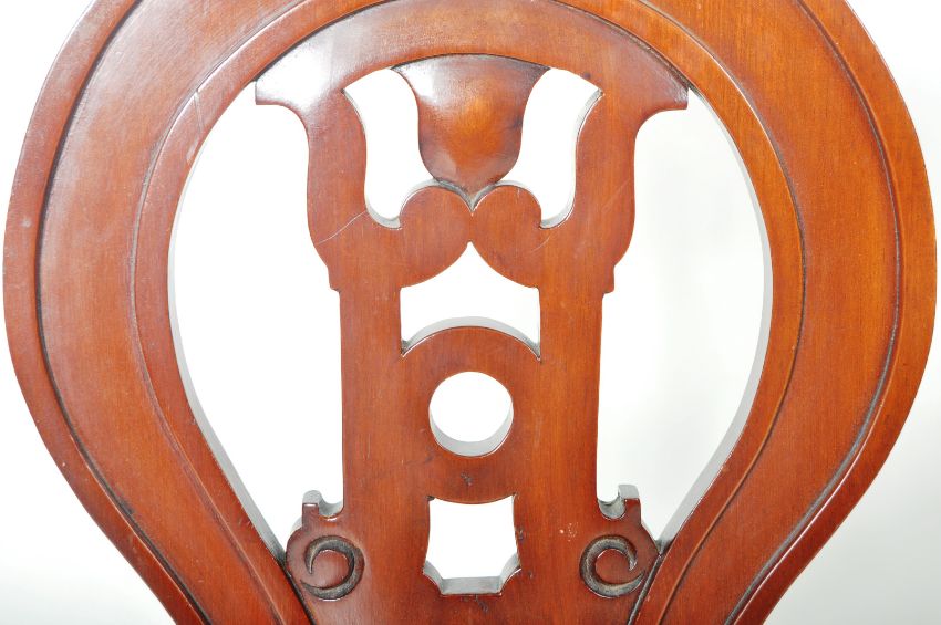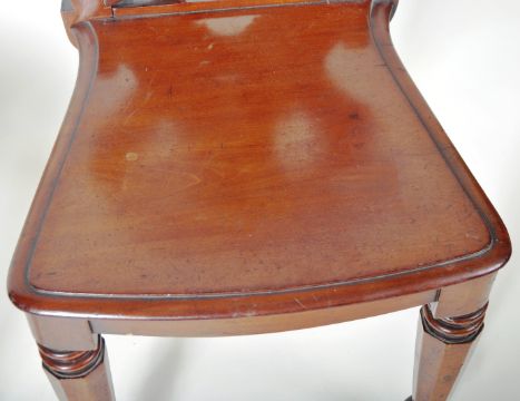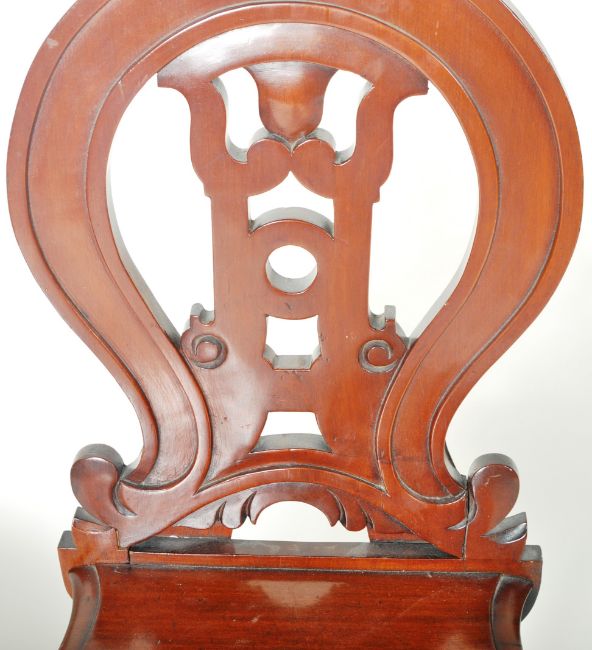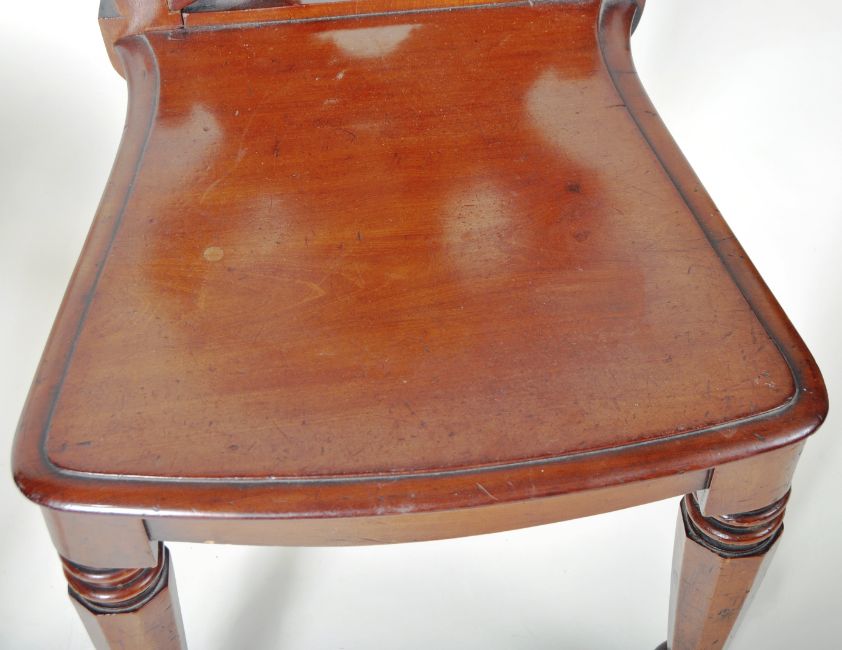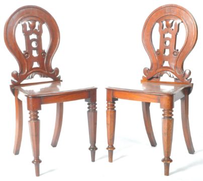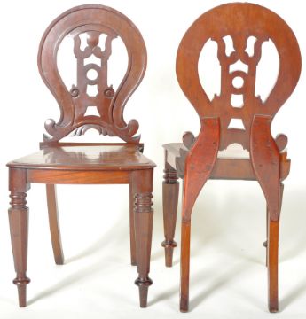 A matching pair of 19th Century Victorian mahogany hall chairs having shaped backrest with carved scroll decoration to the central splat with shaped seat rest below. All raised on turned tapering supports. Each chair measures approx;
