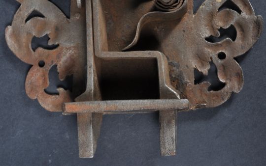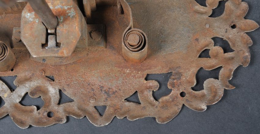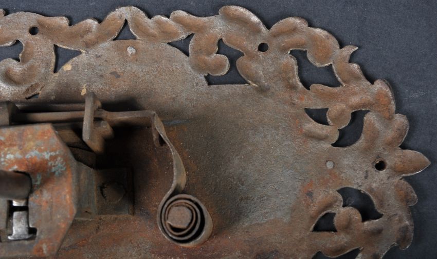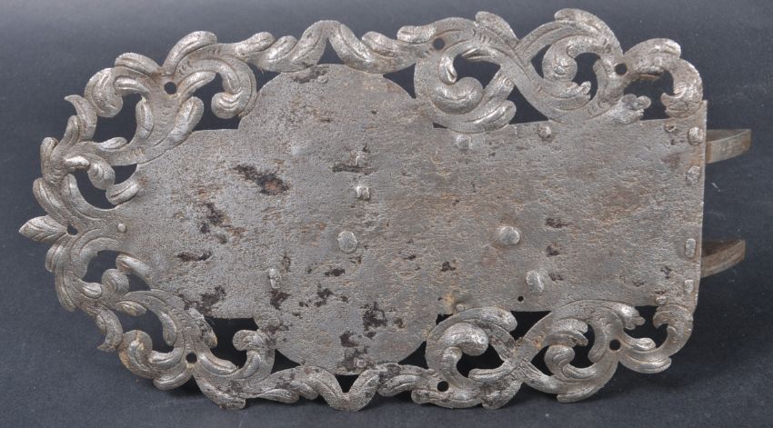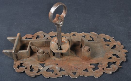 A 17th Century German engraved steel lock and key in good condition. The steel case having a worked foliate pierced plate with shaped end with engraved scroll decoration. The key having a double S shaped end. Wear commensurate with age. Measures approx; 26cm x 15cm.