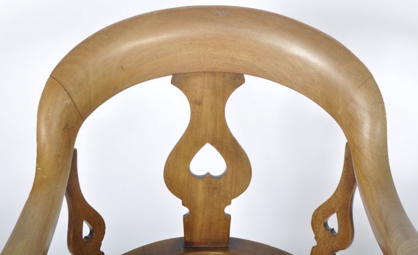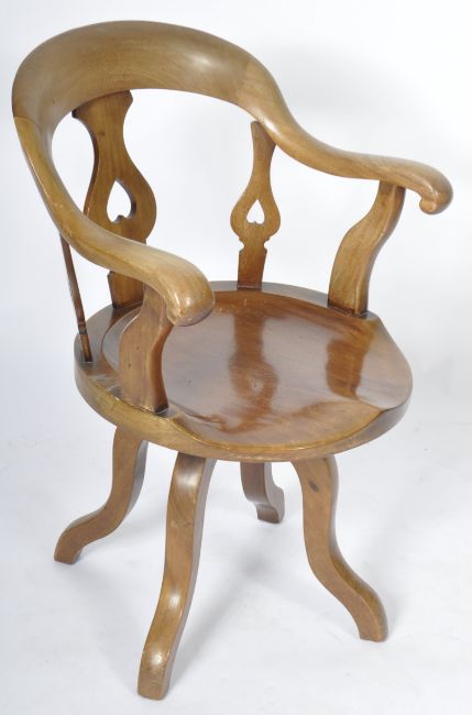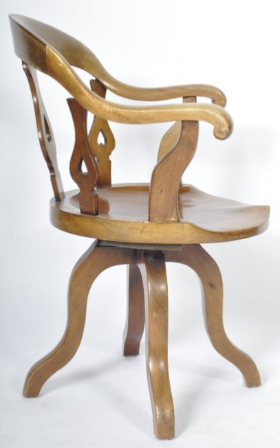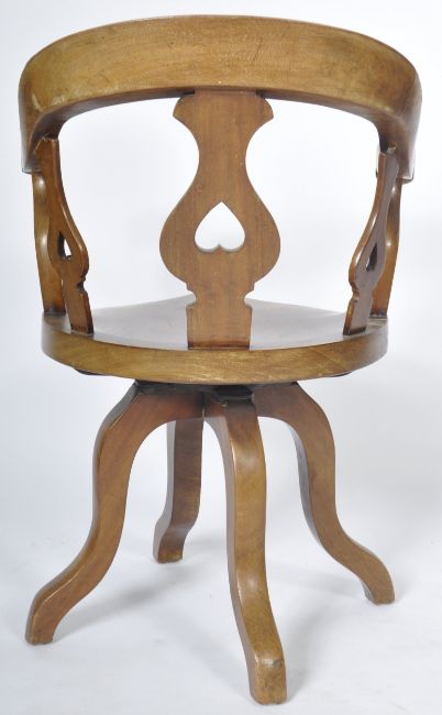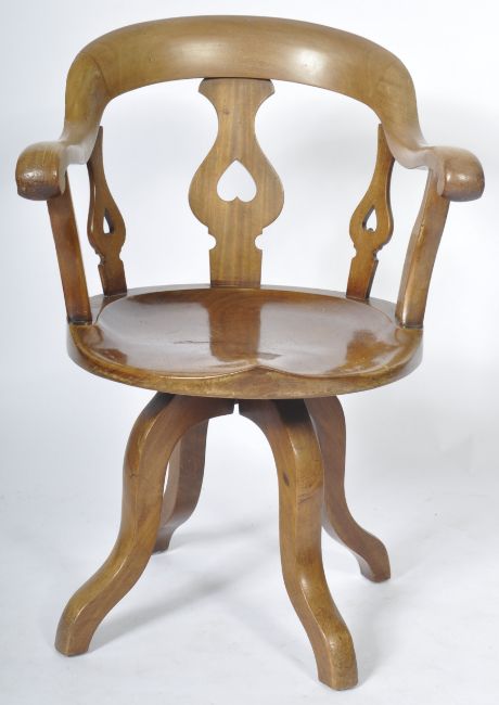 A 19th Century Victorian Arts & Crafts movement walnut revolving swivel ships captains chair / office desk armchair or casino dealers dealing arm chair having a shaped backrest and broad scrolled arms with pierced upside down heart motifs. Shaped saddle seat raised on four sabre leg quadruped splayed base. Measures approx; 89cm x 49cm x 49cm.