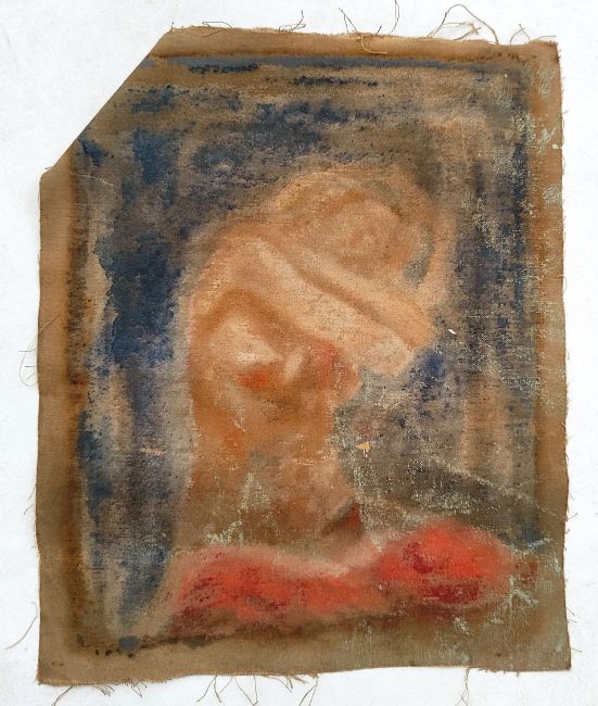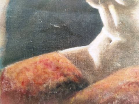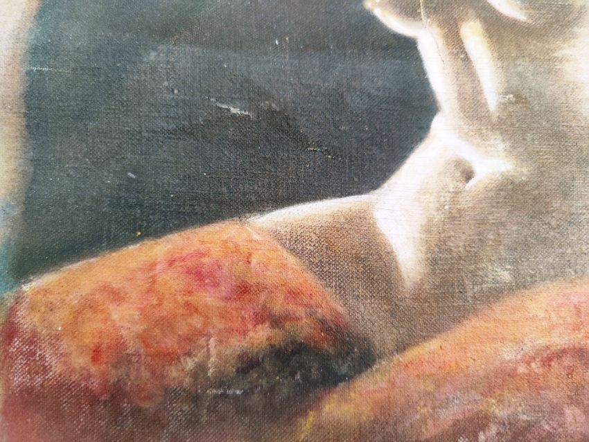 A 20th Century oil on canvas portrait painting depicting a nude female embracing herself with dark tones to the back drop. Unsigned and unframed. Measures approx; 45cm x 36cm.