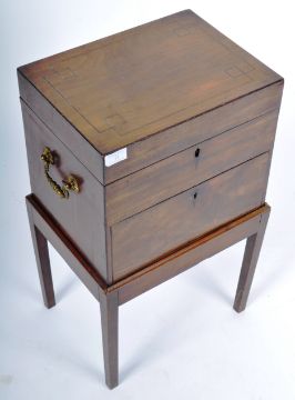 An early 19th Century Regency mahogany work box on stand. The box having a hinged lid and drawer section with gilt brass ormolu swing handles to sides. All raised on tapered square leg stand. Measures approx; 62cm x 38cm x 29cm.