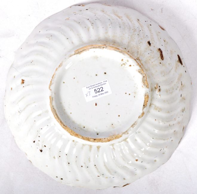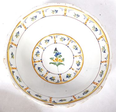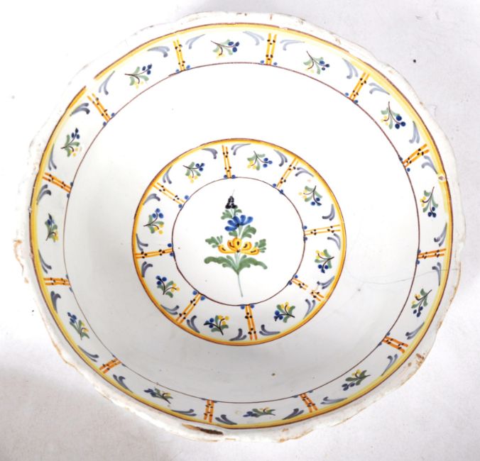 A selection of three 18th to 19th Century French Faience large tin glazed fruit / serving bowls with each having flared rims with hand painted decoration throughout. Wear commensurate damage with hairlines and chips. Largest measures approx; 10cm x 34cm.