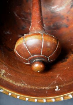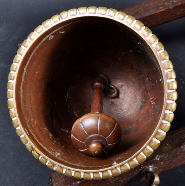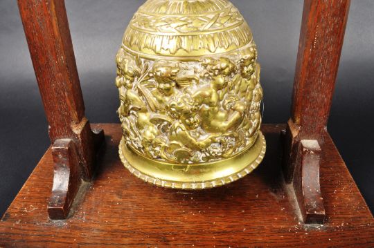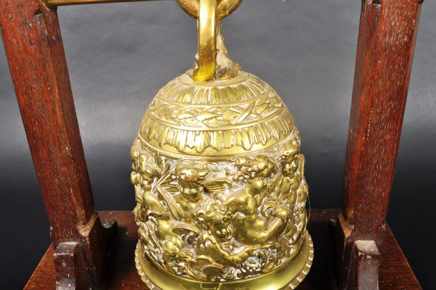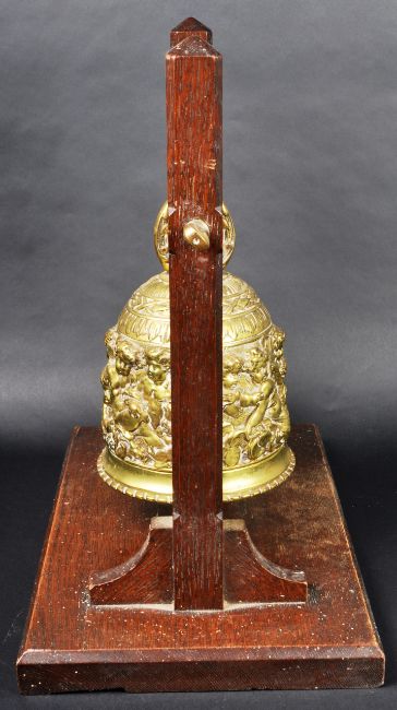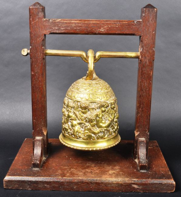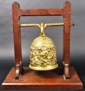 A 19th Century Dutch / European brass monastery bell. On a dark wood frame / stand & suspended on a brass bar. The bell is ornately decorated with the middle band adorned with scenes of cherubs / putti. Condition; age related wear & tarnishing to be expected but no signs of major damage or repair. Measures approx; 39cm x 36cm x 22cm.