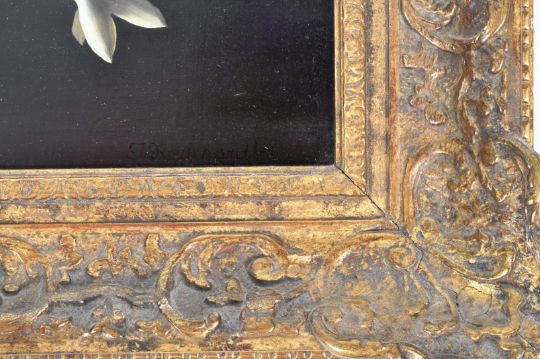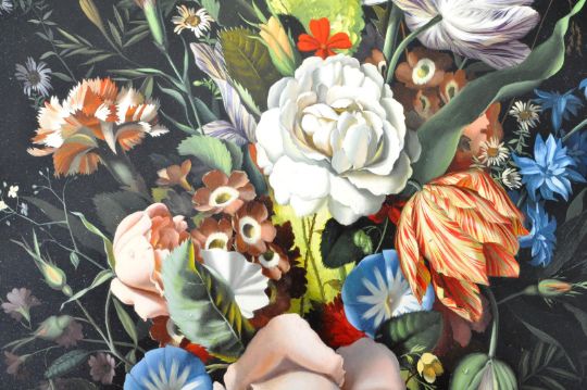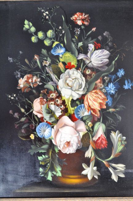 Josef Reinhardt (Flemish, b. 1918) - A mid 20th Century still life oil on canvas painting study depicting bouquet of centrepiece flowers having a dark finished background drawing attention to the colourful arrangement. Set within a decorative gilt frame. Signed by the artist J. Reinhardt to the bottom. Measures approx; 77cm x 69cm.