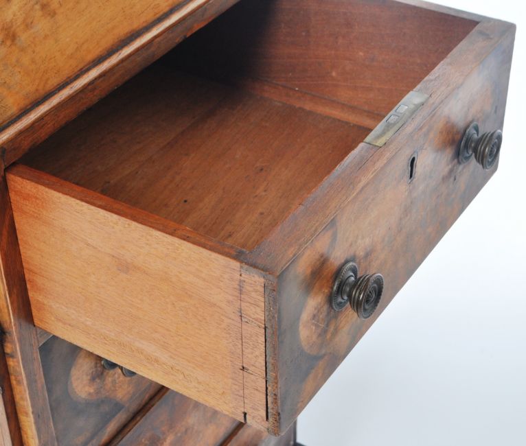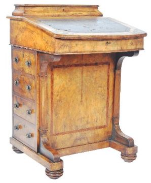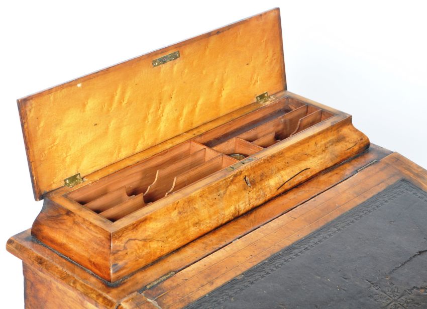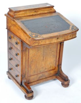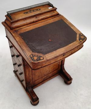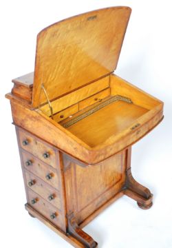 A 19th Century Victorian Walnut Davenport writing table desk having a brass gallery rail top with opening desk tidy compartments, hinged lid with inset leather writing sciver with further fitted interior and set with bank of four drawers to the sides. All raised on bun feet. Measures approx; 86cm x 55cm x 53cm.