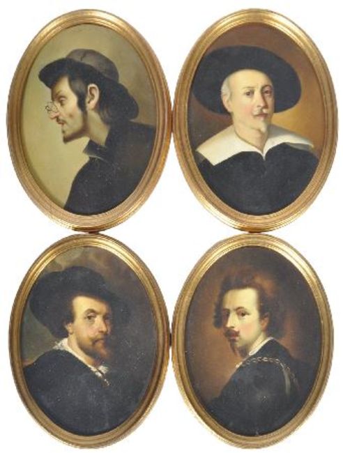 A set of four 20th Century reproduction oval oil on board self-portrait paintings in the manner of Italian and Dutch Old Masters. The paintings depicting Guido Reno, Vandyke, Carlo Dolce and Paul Ruben's. Each set within a modern gilt frame. Each measures approx; 22cm x 17cm.