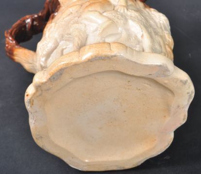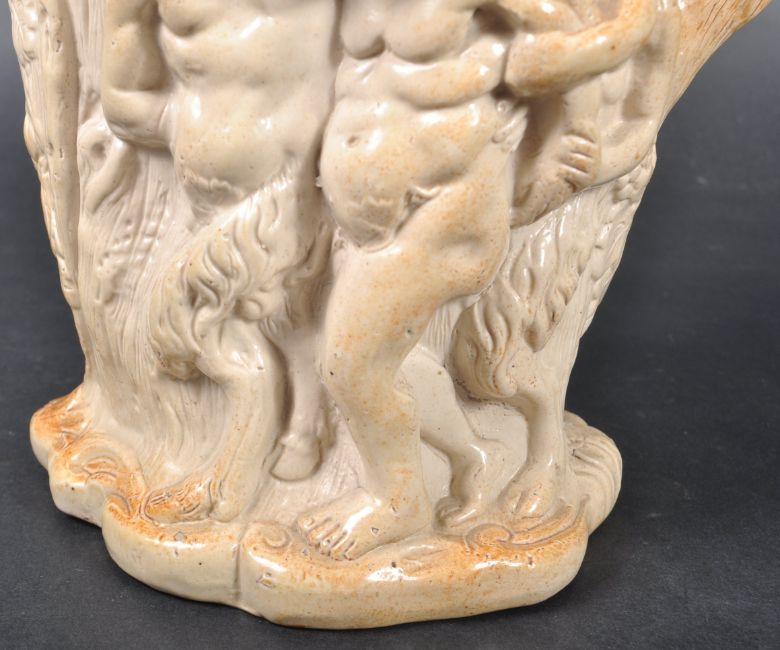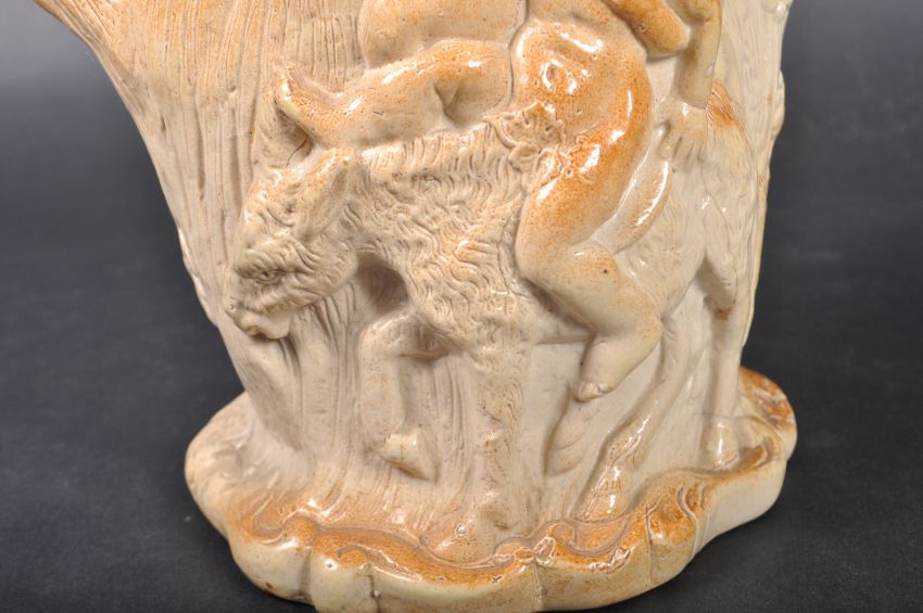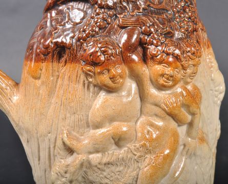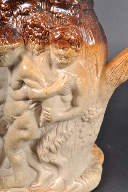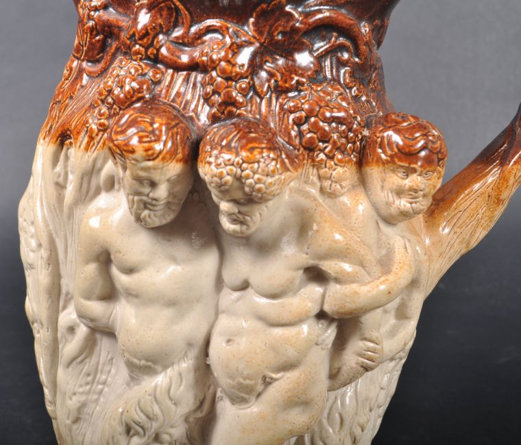 A 19th Century Brampton salt glazed stoneware jug / ewer or pitched having relief moulded decoration depicting classical scenes of Silenus & Satyrs. Chips & cracks present. Measures approx; 22cm tall.