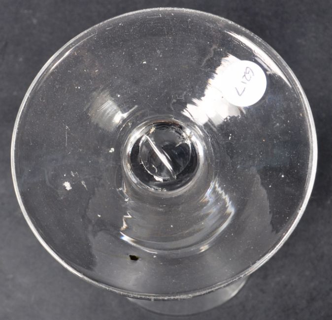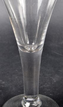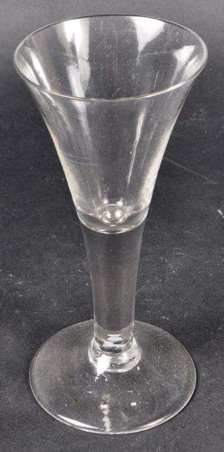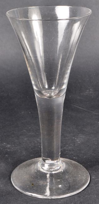 An 18th Century George III glass wine drinking glass having a pulled trumpet bowl with plain stem over a conical circular foot. Measures approx; 18cm tall.