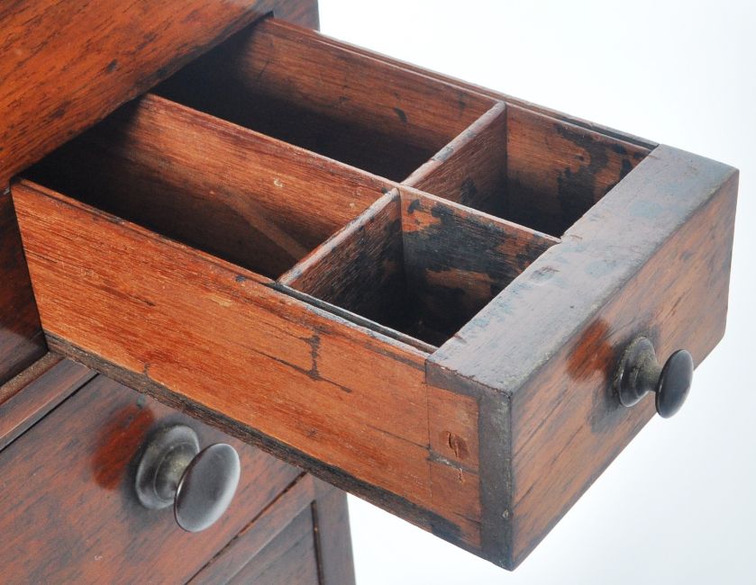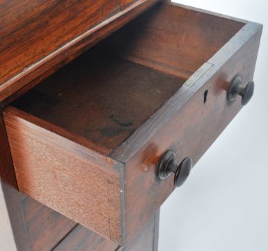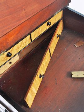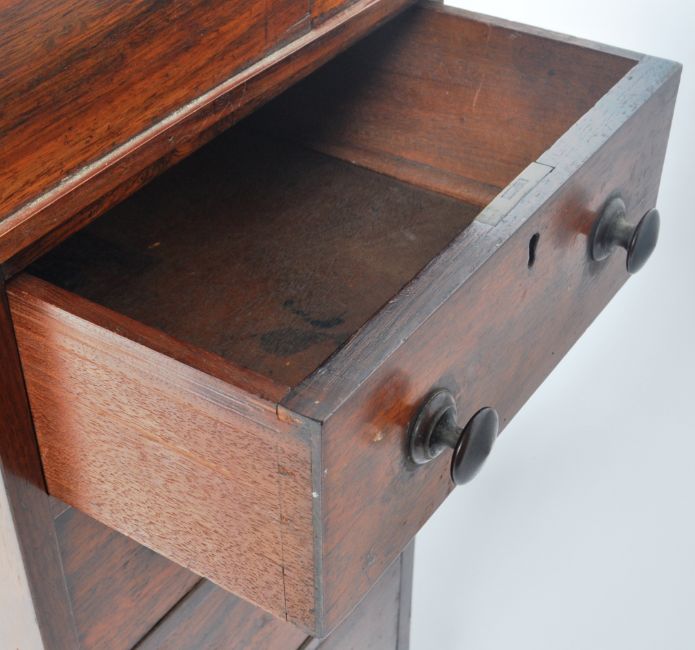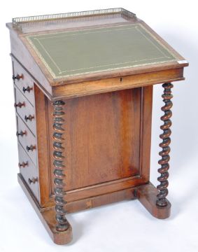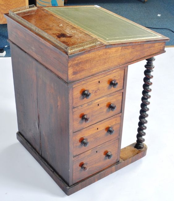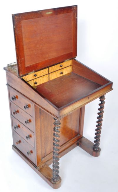 A 19th Century Rosewood Davenport writing table desk in the manner of Gillows Of Lancaster & London. Comprises a brass pierced gallery to the top with inset leather writing sciver hinged section opening to reveal a maple lined fitted interior with pull out pen stand inkwell section. Set of drawers and false drawers to the sides with barley twist column section. Measures approx; 84cm x 56cm x 59cm.