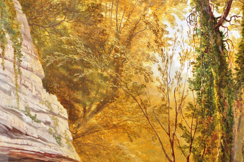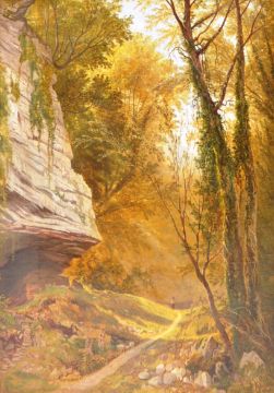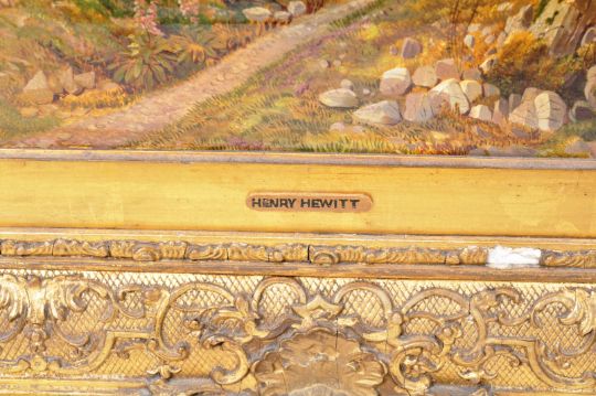 Henry Hewitt (1818-1875) - Grounds of Oldbury Court - 19th Century oil on canvas landscape scene painting depicting a forest path with thick trees and sheer cliff / rock face, the blue sky pushing through the tree tops. Signed and titled verso, inscribed and dated June 1856. Set to an ornate gilt frame. Measures approx; 40cm x 30cm / frame 63cm x 53cm.