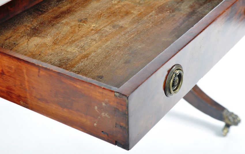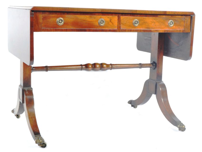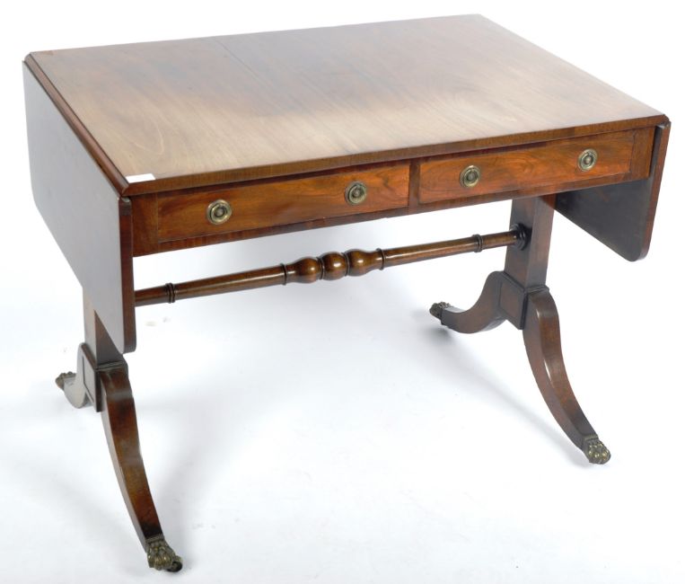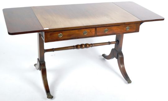 An early 19th Century Regency period mahogany sofa table writing table desk having twin drop leaves to each side with faux drawers to one side and a pair to the other with each having brass hoop handles. All being raised on shaped supports upon brass hairy paw feet castors united by a single turned stretcher. Measures approx; 74cm x 94cm x 64cm.