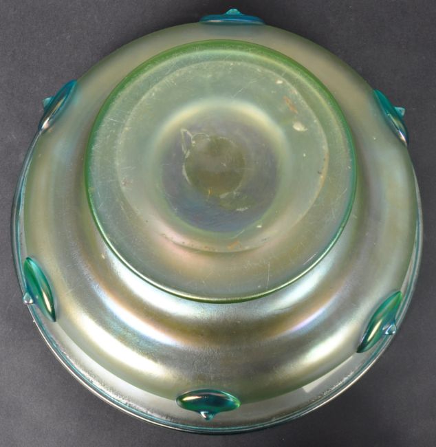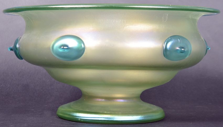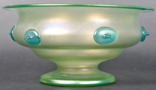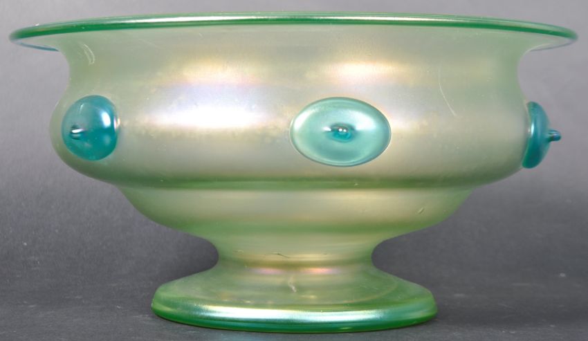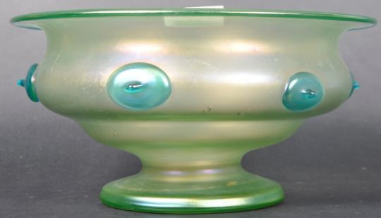 Loetz - Orpheus - An early 20th Century large glass vase / centrepiece bowl of footed ovoid form with a flared rim, decorated in the Orpheus pattern with applied green iridescent spots. All raised on a circular foot. Measures approx; 15cm x 28cm diameter.