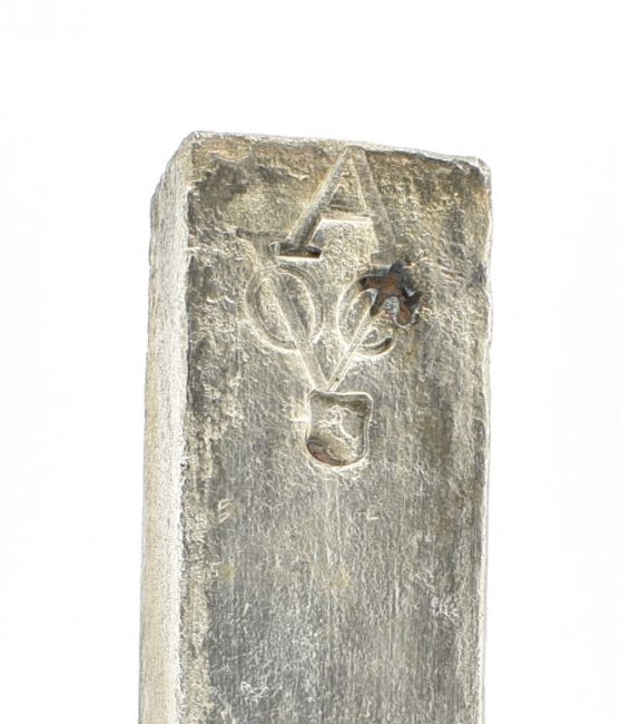 A maritime Dutch East India Company V.O.C. (Vereenigde Oost-indische Compagnie ) silver ingot bar. The silver ingot was salvaged from the shipwreck of the Rooswijk in 2005. The ingot having V.O.C conjoined stamp with A for Amsterdam, together with assay masters stamp of a rampant goat.