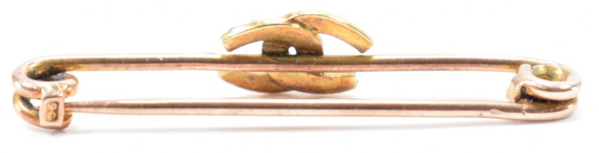 An antique 9ct gold turquoise and pearl bar brooch pin. The brooch having entwined lucky horseshoes set with turquoise and pearl to safety pin clasp. Weight 3.1g. Marked 9c. Measures approx 4cm.