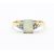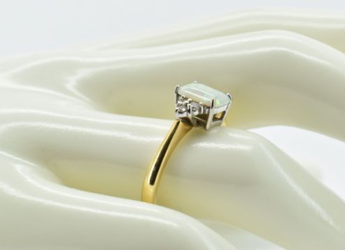 A hallmarked 18ct gold opal and diamond ring. The ring having a rectangular cabochon cut opal exhibiting a full spectrum play of colour flanked by diamonds set to a tapering band ring with additional ring reducer.  Hallmarked Birmingham. Reducer marked 9ct. Total weight 4.3g. Size Q.