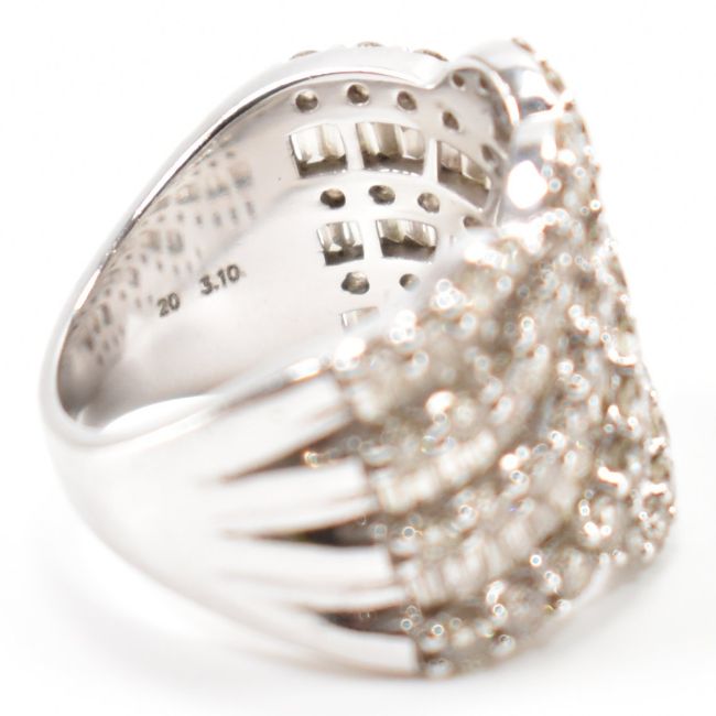 A hallmarked 9ct white gold and diamond ring. The ring set with round brilliant cut, baguette and trapeze  cut diamonds. Hallmarked Birmingham. Estimated diamond weight 3ct. Weight 9g. Size N