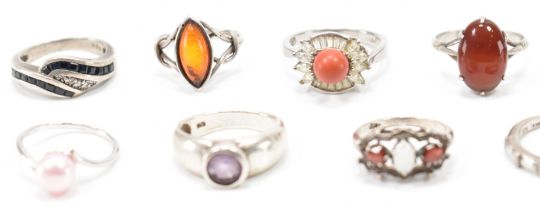 A collection of silver stone set rings. The lot tol include; three stone cabochon rings (one having a broken shank at shoulder), a three stone ring, a navette stone set ring, a bezel set purple stone ring, pink simulated pearl ring, a blue & white stone crossover ring, a CZ set ring & an art deco style orange & white stone set ring. All marked 925 / silver or test as silver. Total weight approx 31.2 g. Sizes approx; K.5, L, L.5, M.5, O, P, S.