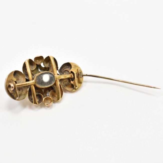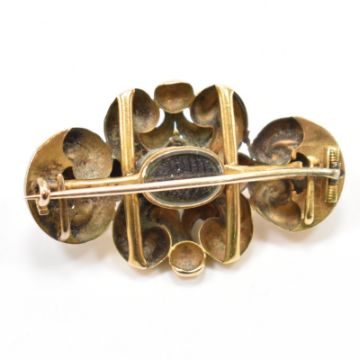 A 19th Century Victorian gold and ruby mourning brooch. The brooch of scrolled form being set with a central oval ruby cabochon, flanked by two further cabochons, with hinge pin and hair compartment panel to verso. Measures 3.7cm wide. Weight 5.3g .Central ruby measures 6.1 x 8.2mm. Tests indicate 15ct gold.