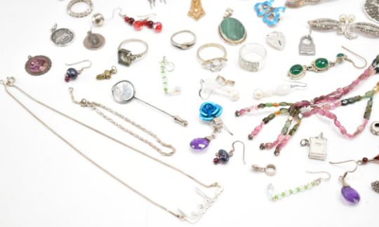 A collection of silver and white metal jewellery. The lot to include bangle, bracelets, necklace, chains, selection of rings, filigree leaf brooch, malachite pendant etc. Many marked 925 / silver, some white metal present. Gross weight 292g.