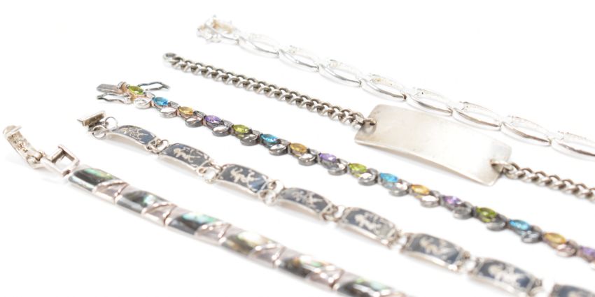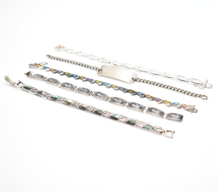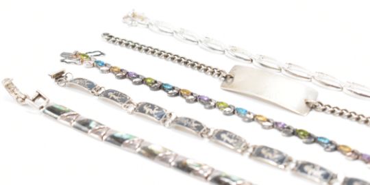 A collection of white metal & silver bracelets. To include; abalone set, paste set, niello thai sterling silver, hallmarked signet bracelet & sterling silver chain bracelet. Weighs approx 74.6 g. Measures approx 16 - 20cm.