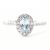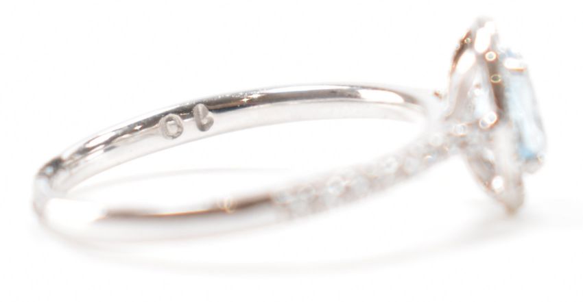 A hallmarked platinum, aquamarine and diamond ring. The ring being set with an oval cut aquamarine to the centre with a halo of diamonds surrounding it and further diamonds accents to the shoulders. Hallmarked 950 Sheffield. Weight 3.1g. Size L.5. Central stone measures approx 6 x 4.5mm. Surrounding diamonds measure approx 1.5 x 1.5mm.