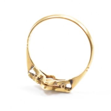 A 1920s Art Deco 18ct gold and platinum panel ring. The ring having a navette shaped head set with three diamond accents. Marked 18ct and plat. Weight 2.1g. Size L.5.