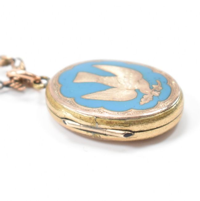 A 19th Century Victorian 9ct gold rope twist chain and gold plated locket pendant. The chain of rope twist form with a spring ring clasp, the lock having an enamelled dove to the front case. Chain marked 9ct. Weight of chain 9.8g.