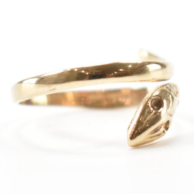 A hallmarked 9ct gold snake ring.  The ring in the form of a coiled snake, hallmarked Birmingham. Weight 1.8g. Size O.