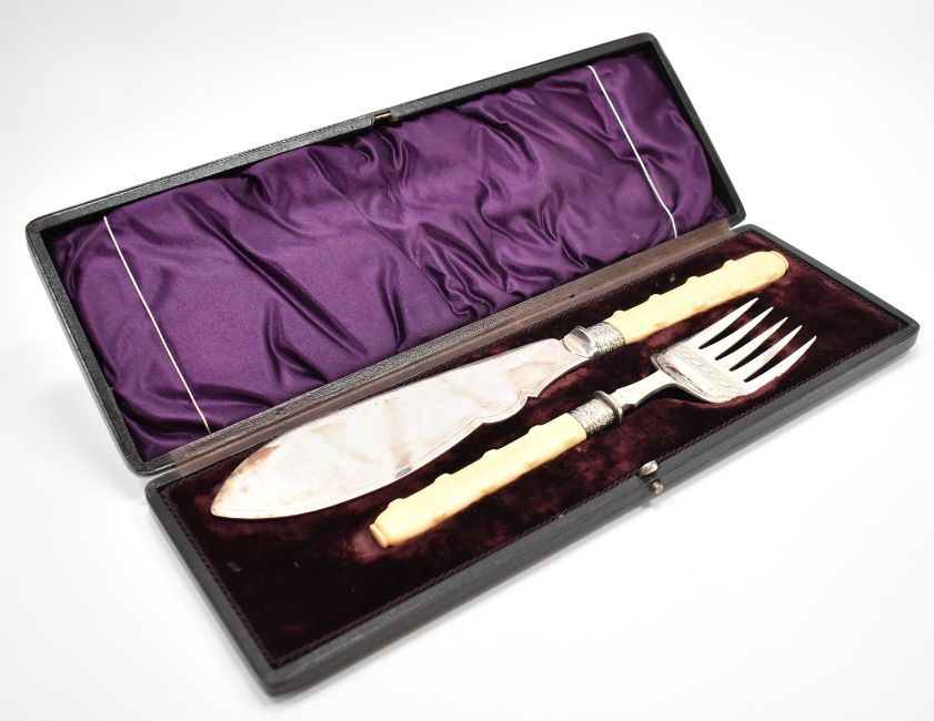 A Victorian 19th century silver plated canteen of cutlery with decorative handles together with another with mother of pearl handles, both AF. Also, a boxed fish knife set.