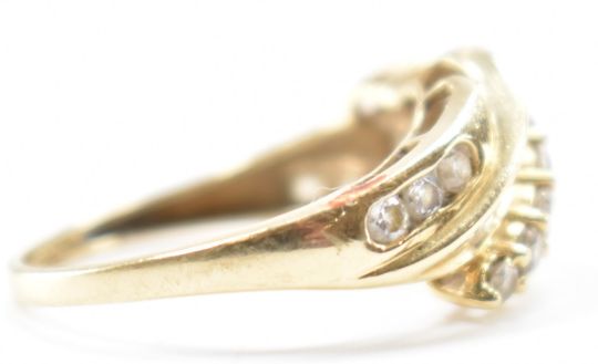 A hallmarked 9ct gold and CZ cluster ring. The ring set with CZ in a crossover domed mount. Hallmarked Birmingham. Weight 3.8g. Size R.