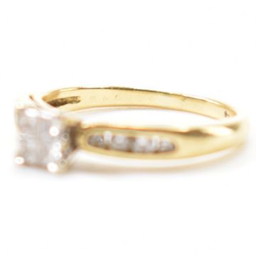 A gold and diamond cluster ring. The ring set with calibre cut diamond head and round brilliant cut diamond shoulders.  Marked 18K, tests indicate 18ct gold. Weight 3.2g. Size L.