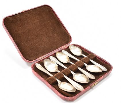A boxed set of hallmarked silver teaspoons. Hallmarked Sheffield. Sponsor 1944 WS ltd.  Weight 85.3g. Measures 11.3cm.