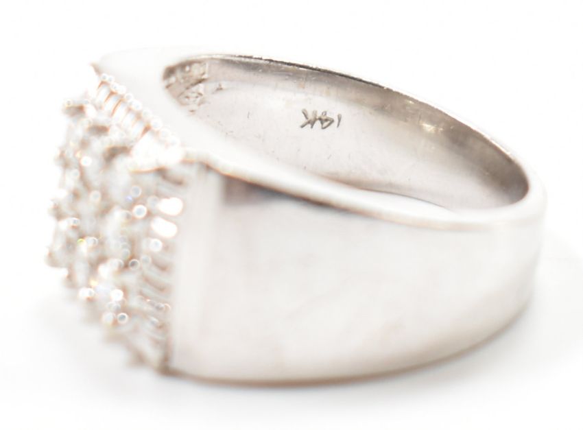 A white gold and diamond ring. The ring having a square head set with nine round brilliant cut diamonds. Marked 14k to the shank. Diamonds measure approx 3 x 1.8mm, estimated 0.81ct in total. Weight 11.6g. Size S.