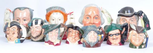 A collection of eleven vintage 20th century character toby jugs, including limited edition characters. The lot to include The Walrus & the Carpenter D6604, Captain Bligh D7074, Armada Queen Elizabeth I of England D6821 n. 1212 of 9500, Armada King Philip II of Spain D6822 n1212 of 9500, The Falconer D6547, Dick Turpin D6542, Pied Piper D6514, Rip Van Winkle D6517, Capt Henry Morgan D6510, Mine Host D6513, Robin Hood D6541. The tallest jug measuring approx. 12cm. The lot appears in overall good conditions with minor wear commensurate with age, no apparent chips or cracks.