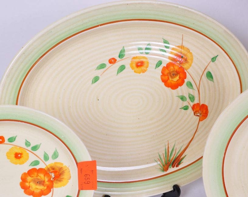 A collection of three early 20th century circa 1930s Art Deco Clarice Cliff Corolla pattern plates. The plates all having hand painted polychrome floral decoration. Makers mark to the underside. Measures 36cm.
