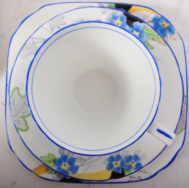 An early 20th century circa. 1920's Art Deco Sutherland bone china tea service comprising of teacups, saucers, side plates (trios), sugar bowl and cake plate. Each piece being hand painted with blue florals.
