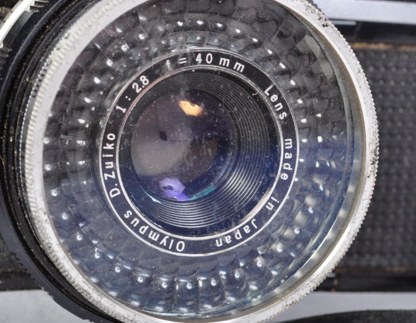 A vintage 20th century Olympus Trip 35 film camera. Lens Olympus D-Zuiko 1:2,8 f=40mm. Model number 2456923. Measures 12cm length.