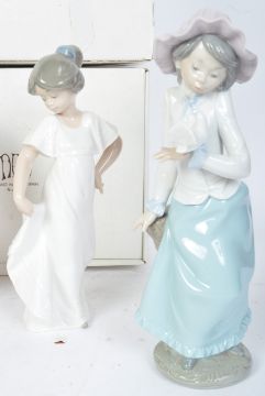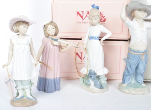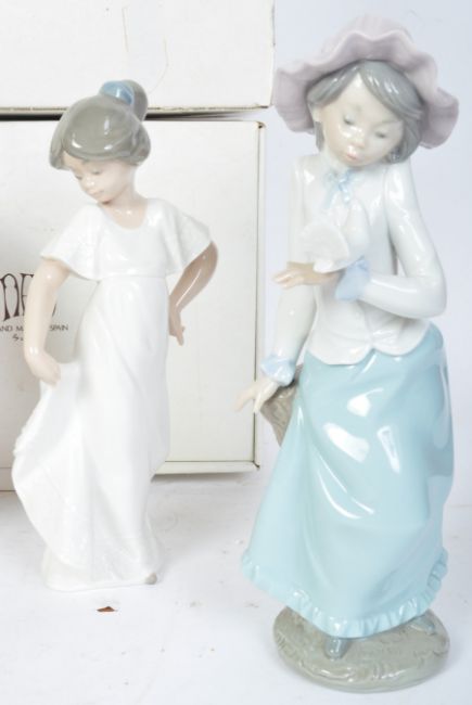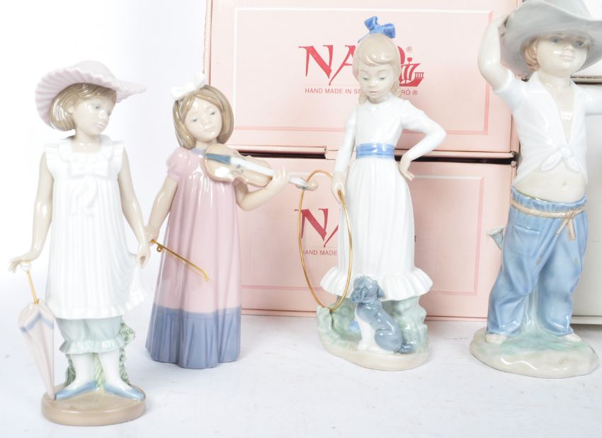 An assortment of vintage 20th century Spanish porcelain Nao figurines to include Girl with Dove, Dancing Clown, How Pretty, Big Hat, Girl with Violin, My Dog Does Tricks. The majority being boxed. Lot in overall good condition - break to the finger of Girl with Dove. Measures 25cm tall.