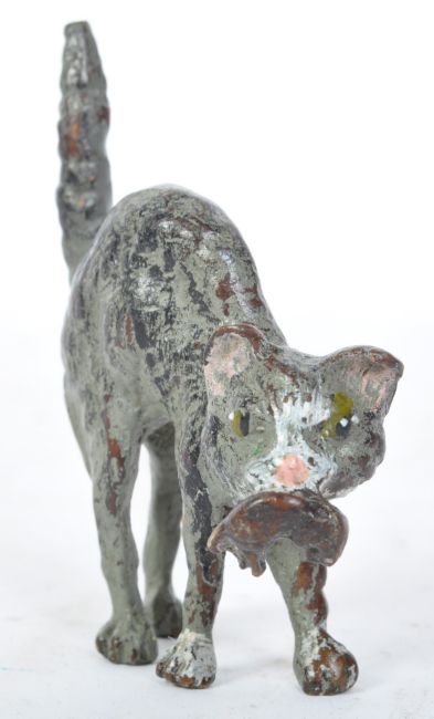 A vintage 20th century cold painted bronze figure in the form of a cat and mouse. Measures 62mm tall.