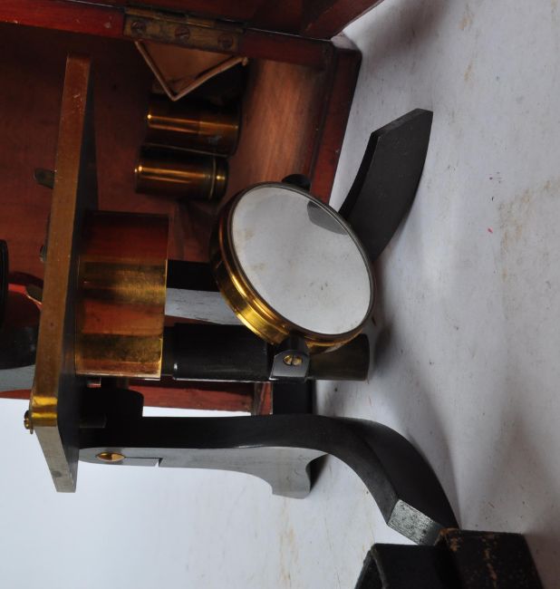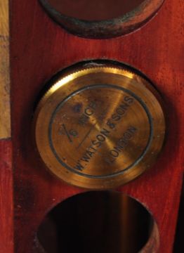 Of scientific interest - A early 20th century brass Watsons & Sons microscope. The microscope stamped W.Watson & Sons 313 High Holborn, London. Stamped 3122. Comes with various lens and slides. Comes in a mahogany box  with carry handle to the side.