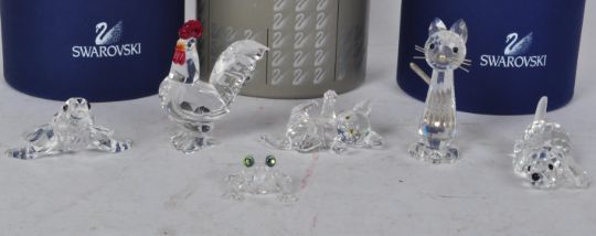 A group of 6 Swarovski crystal animals. The lot to include a frog (286313), a dog (172296), a sitting cat (183274), a playful cat (631857), a cockerel (247759), and a seal (221120). All boxed & with certificates of authenticity. Seal measures approx. 5cm long.