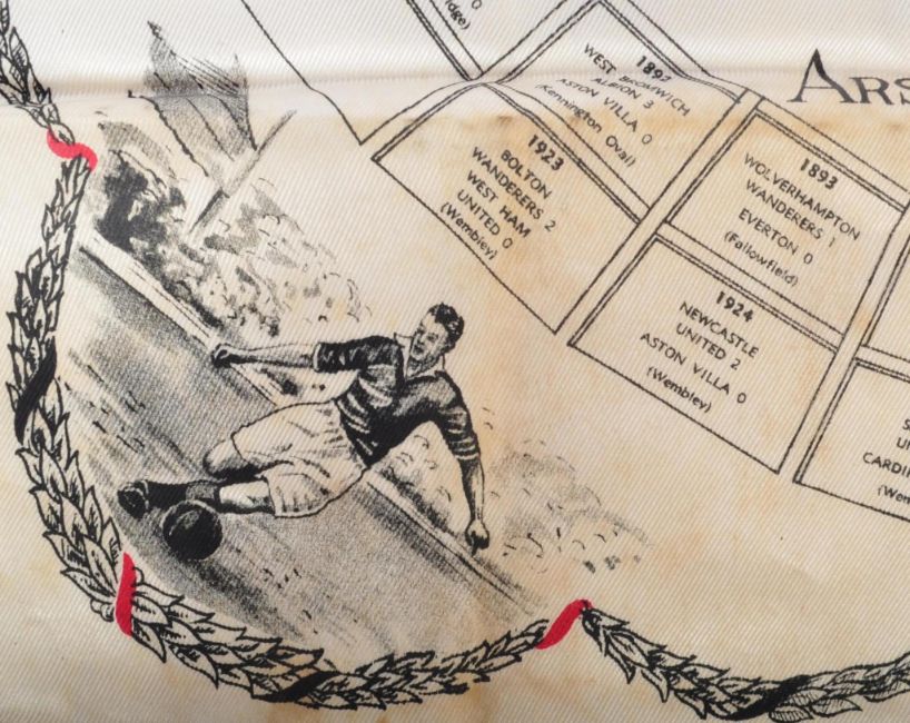 A mid 20th century Football Association English Cup 1951-1952 silk handkerchief for Arsenal V Newcastle game depicting footballing scenes and a circular history of the cup from 1872. Measures approx 43 x 43cm.