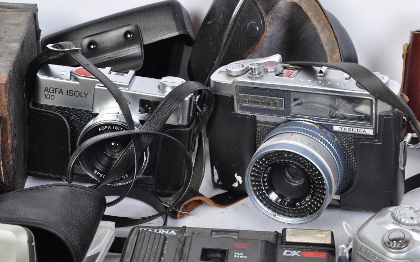 A collection of vintage 20th century photographic cameras and lenses to include a Yashica T4, (boxed) Pentax Zoom 105-R, a Yashica TL-E, Afga Isoly 100, Yashica Minimatic-C together with a variety of flashes, film and other pieces of photographic equipment.