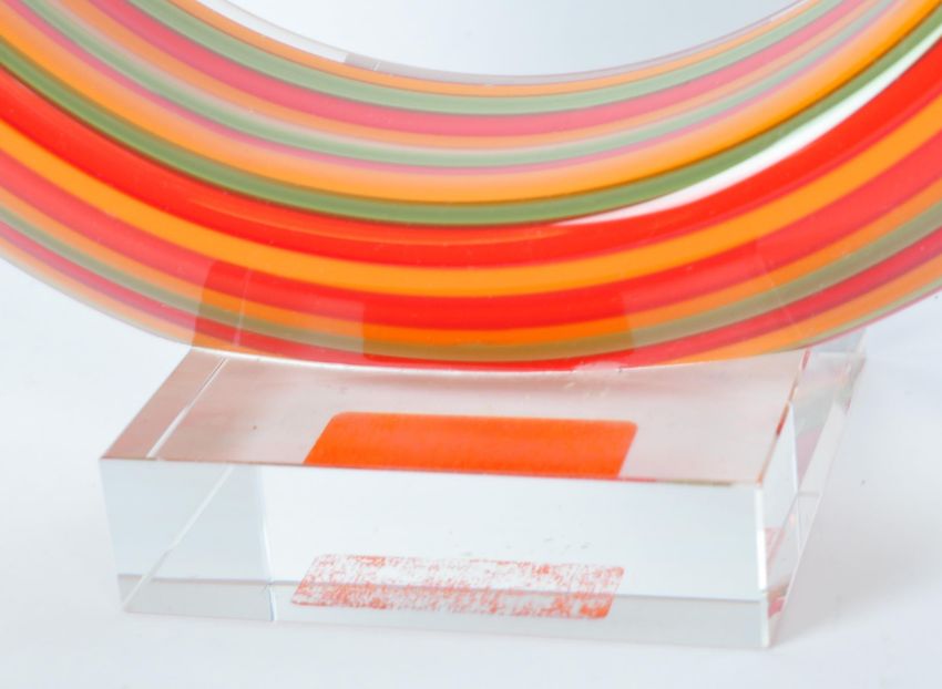 A vintage retro Murano swirl colourful glass sculpture. The sculpture having a U shape with spiral swirls to both sides in orange, green and red stripes. The sculpture stands on a clear glass plinth. It appears in overall very good conditions with no apparent crack, chip or damage. It measures approx. 25 x 24cm.