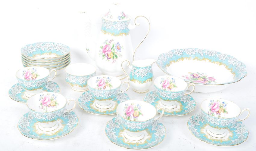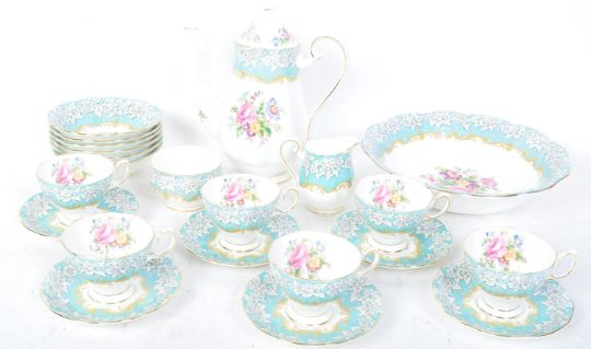 A 20th century Royal Albert Enchantment bone china tea / coffee service comprising of 6 fruit bowls, cup and saucers and one large fruit bowl. The service having a blue border to the top with monochrome floral decoration. Service has a makers mark to the underside. Very good condition.